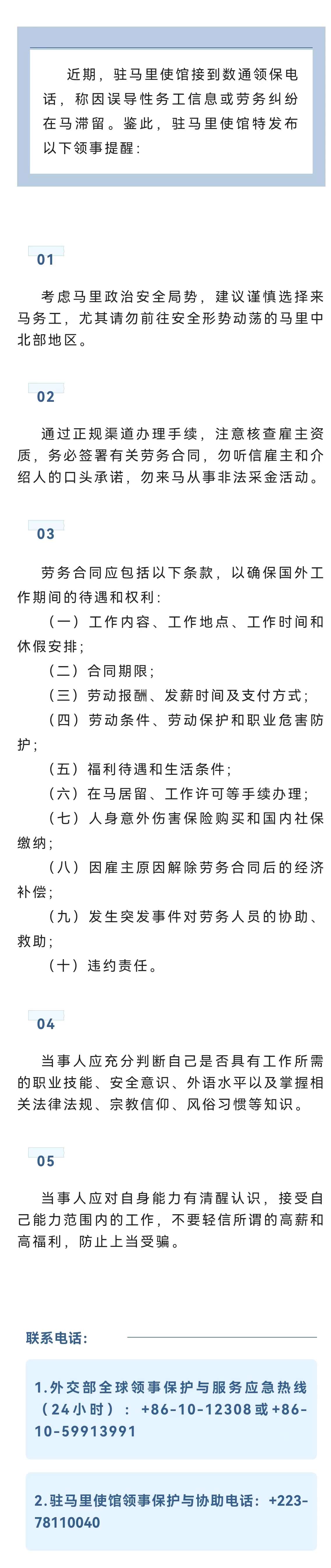 驻马里使馆关于中国公民赴马务工的领事提醒