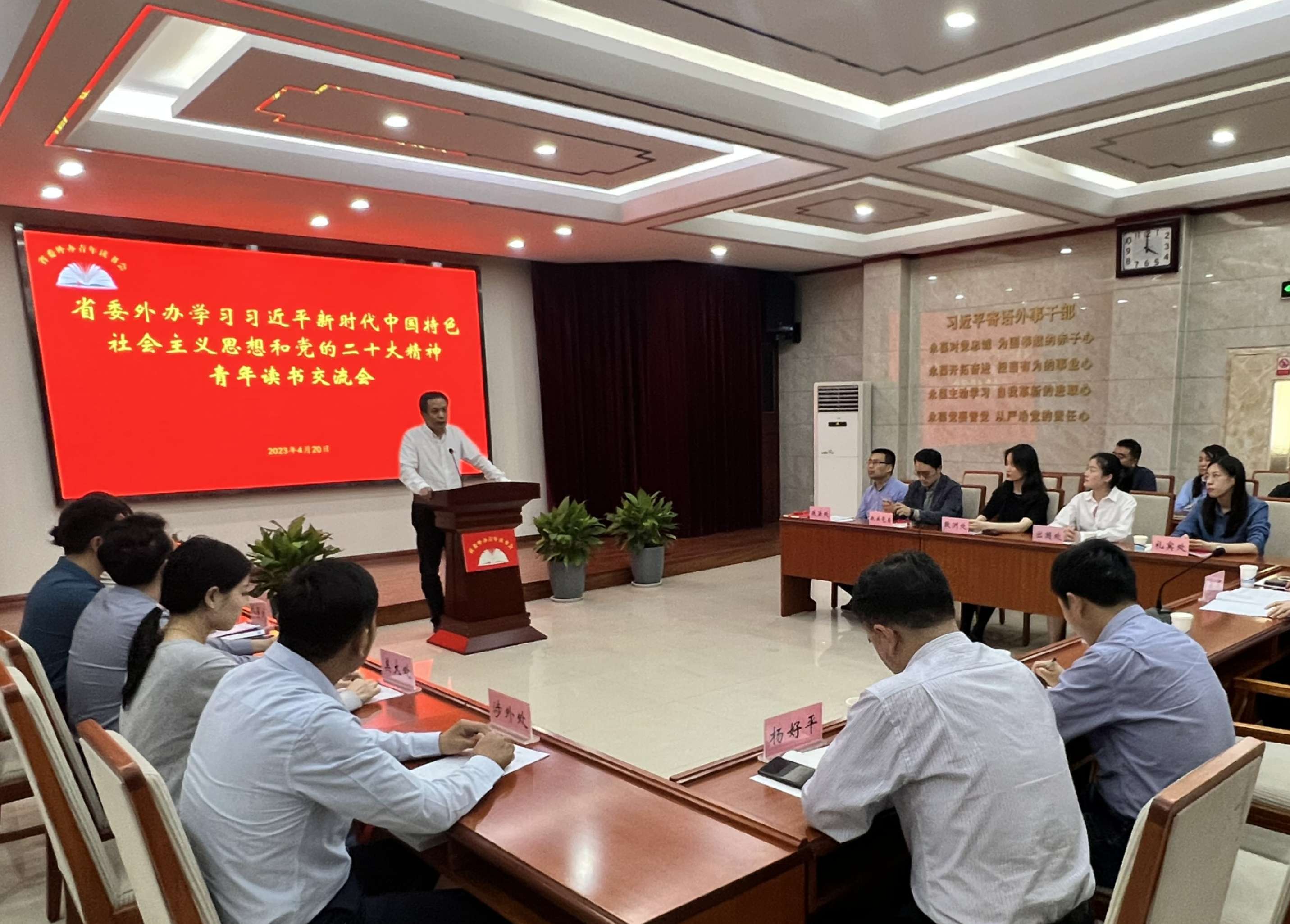 为助力省委外办学习贯彻习近平新时代中国特色社会主义思想主题教育开好局、起好步,引导青年做到以学铸魂、以学增智、以学正风、以学促干,在世界读书日和五四青年节来临之际,4月20日下午,省委外办以学习习近平新时代中国特色社会主义思想和党的二十大精神为主题举办青年读书交流会。省委外办主任梁杰一出席并讲话,来自机关各支部青年读书小组的10名代表交流学习体会,机关青年代表和部分处室负责人参会。