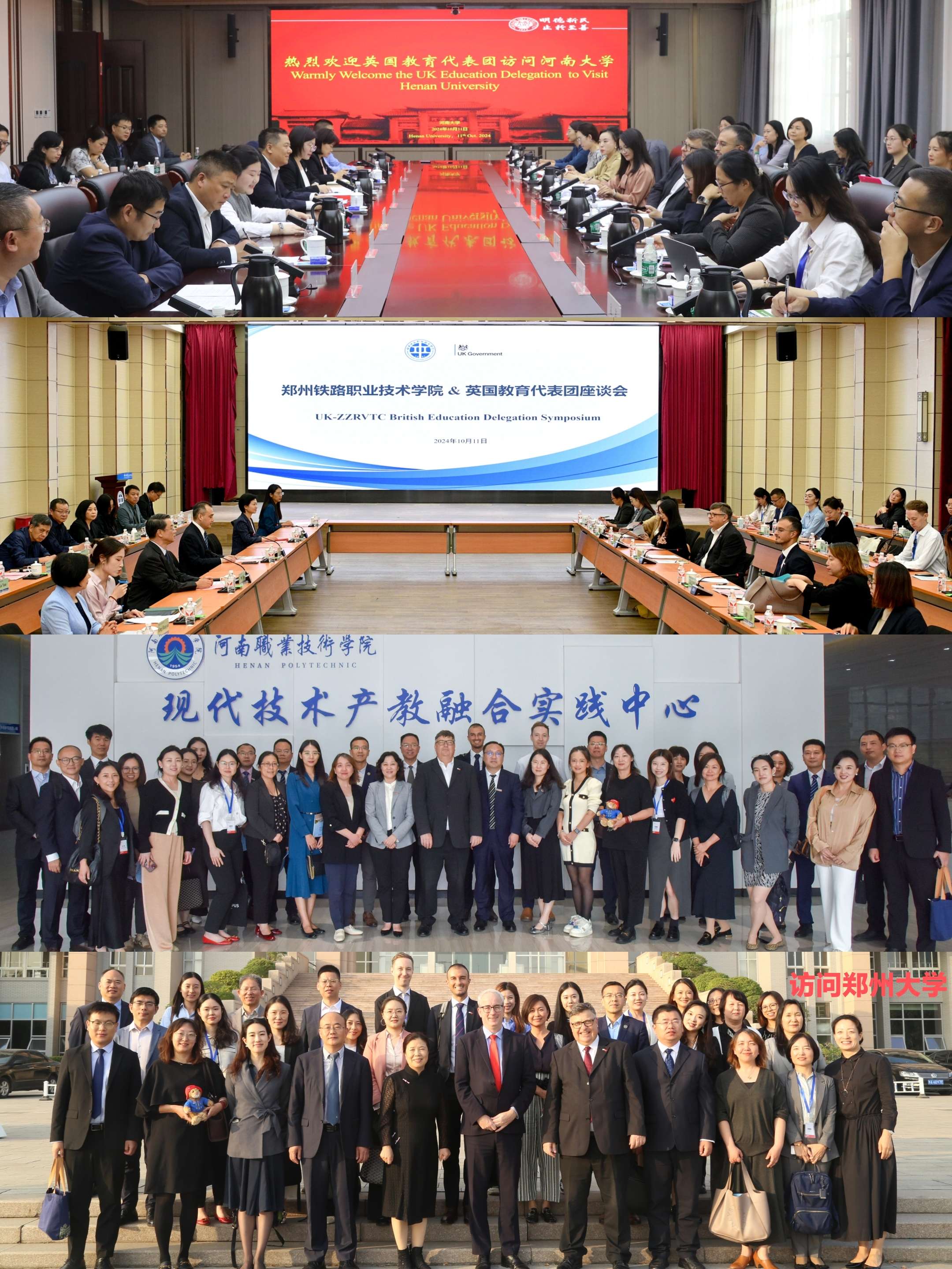 在豫期间,代表团与省教育厅及我省有关高校负责人举办2024年河南英国教育合作交流会,并访问了郑州大学、河南大学、河南职业技术学院和郑州铁路职业技术学院,考察实训基地,就推动双方师生互访、合作办学、联合科研等项目进行商谈。