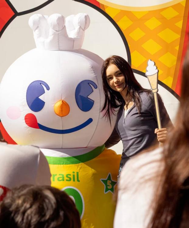 当地消费者与身着巴西足球队球衣的“雪王”亲密互动。