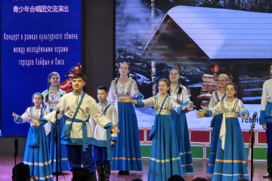 首日,合唱团走进开封市第二师范附属小学、开封市第二十五中学,与开封青少年进行友好交流。聚光灯下,俄罗斯青少年们身着素雅民族服饰,伴随着手风琴的旋律,《喀秋莎》《卡林卡》《小樱桃》等俄罗斯歌曲唱响,展现着俄罗斯人民的热情与坚韧。合唱团与开封市第二师范附属小学“拂晓”合唱团共同唱响中国经典民歌《茉莉花》,清澈的歌声交织在一起,成为两地艺术与友谊交融的最美注脚。此外,开封市第二十五中学生还为团员们献上了豫剧经典选段《谁说女子不如男》,一板一眼的唱腔、灵动传神的动作,将豫剧的豪迈与细腻完美呈现。在文化展示环节,开封市第二十五中国际部学生带领大家感受开封历史底蕴——书法特长生现场挥毫书写“不负韶华”四字,笔墨流转间尽显中国书法的气韵与品格;武术表演刚柔并济的招式、行云流水的动作,展现了中华武术的精气神,引得满堂喝彩。