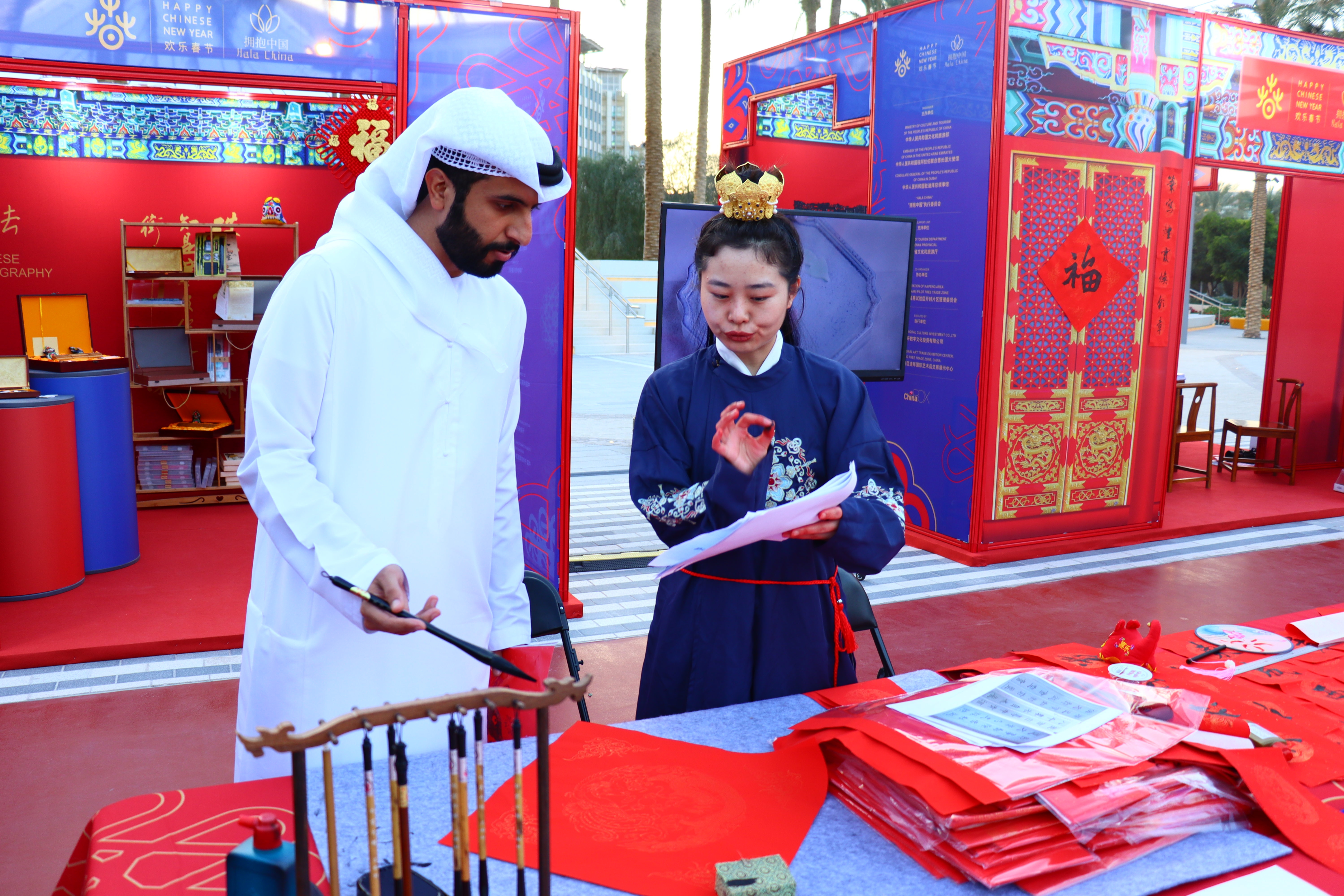 代表团负责人梁启明介绍,由开封片区搭建的“欢乐春节”非遗庙会专题展位以浓郁的中国元素为底色,采取传统非遗技艺与文创产品相结合的方式,向阿联酋人民展示中华优秀传统文化,展品主要有官瓷、汴绣、木版年画、五大名窑、兰考古琴、针灸铜人、中国传统服饰、木艺根雕等。参加此次活动的有来自国内工艺美术大师和非遗传承人,将现场展示宋式点茶、汴绣、活字印刷、古琴表演等中国非遗代表项目,现场观众还能亲身参与迎春书法笔会、雕版拓印、斗茶品茶等中国年味儿十足的新春活动,亲身体验中华优秀传统文化。