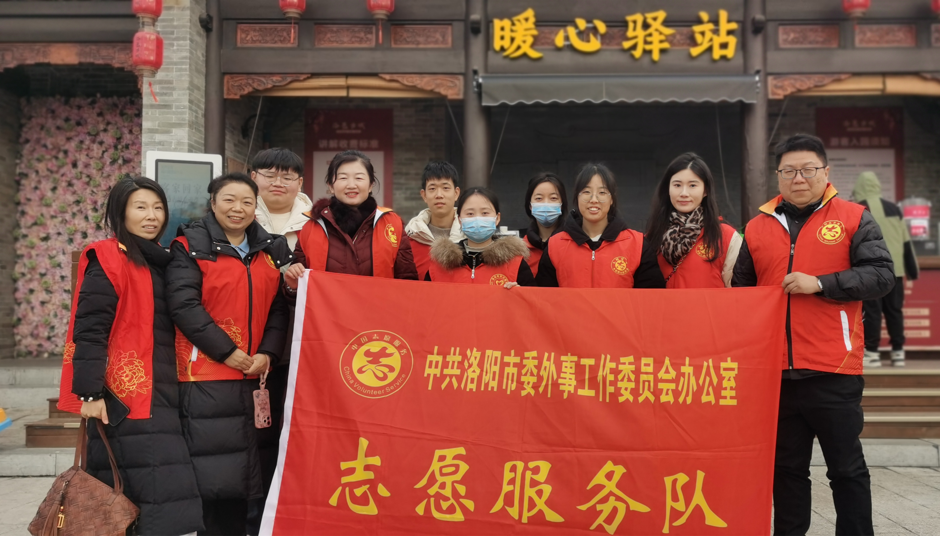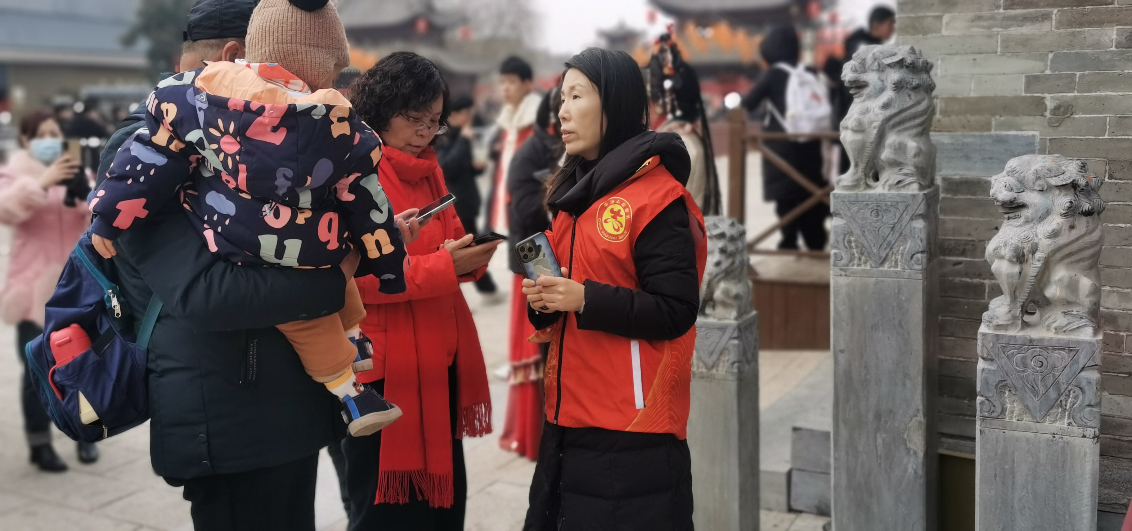 充满春节氛围的洛邑古城,洛阳市委外事办的志愿者们身着红马甲,穿梭在古城街巷,为来自各地的游客提供引路、存包、讲解等热情周到的服务,积极为外地游客介绍洛邑古城的文化特色和春节民俗活动,并热情解答游客们的各种问题,得到了广大游客的赞许。