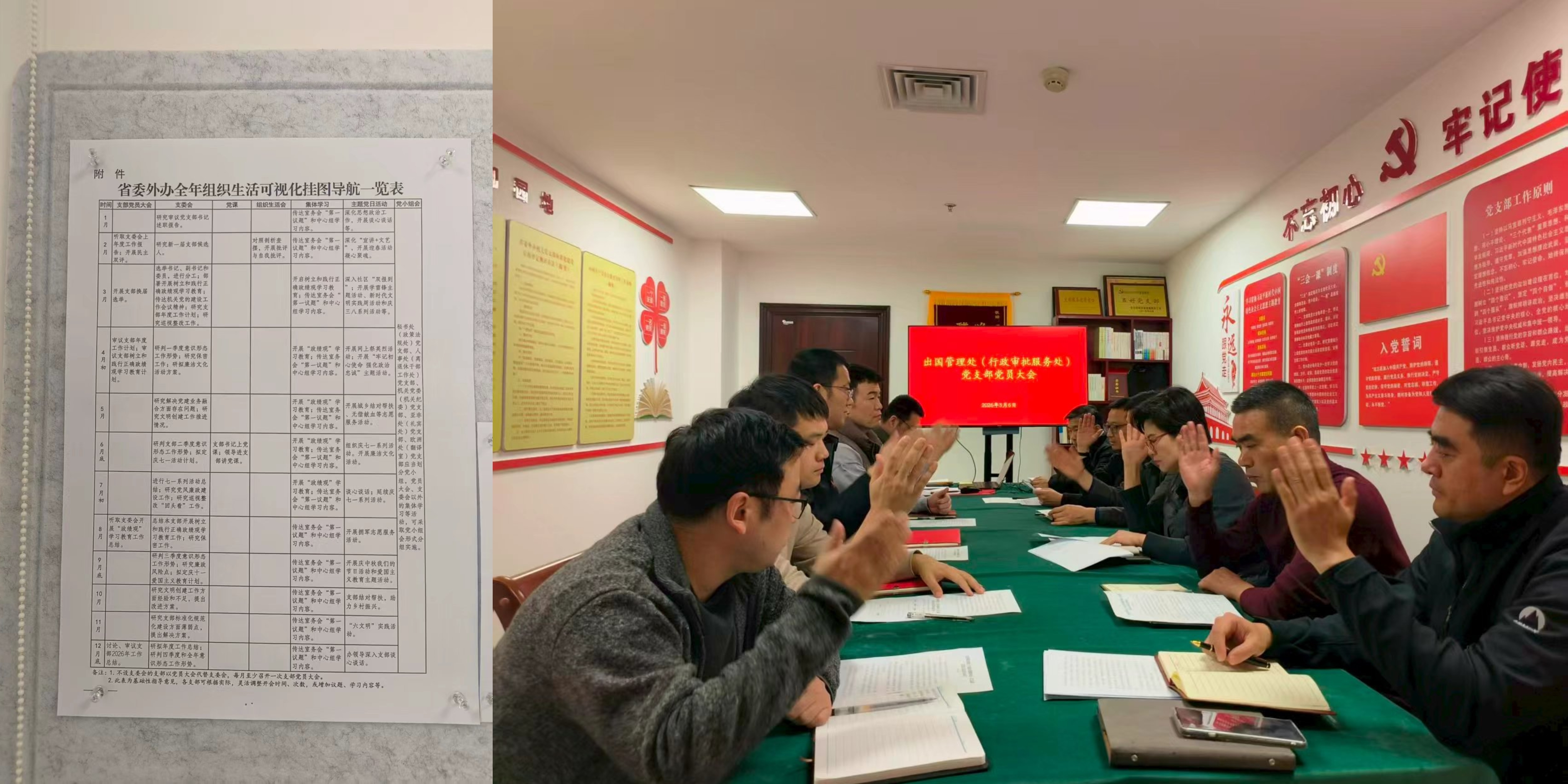 省委外办机关党委树立和践行正确政绩观,以夯实基层基础、抓实支部建设为重点任务,着力破解党的组织生活制度落实不系统、不均衡等难题,依据《中国共产党支部工作条例(试行)》,在深度提炼总结经验、广泛征求办机关各党支部意见的基础上,3月9日起在全办党组织中推行“全年组织生活可视化挂图导航工作法”。