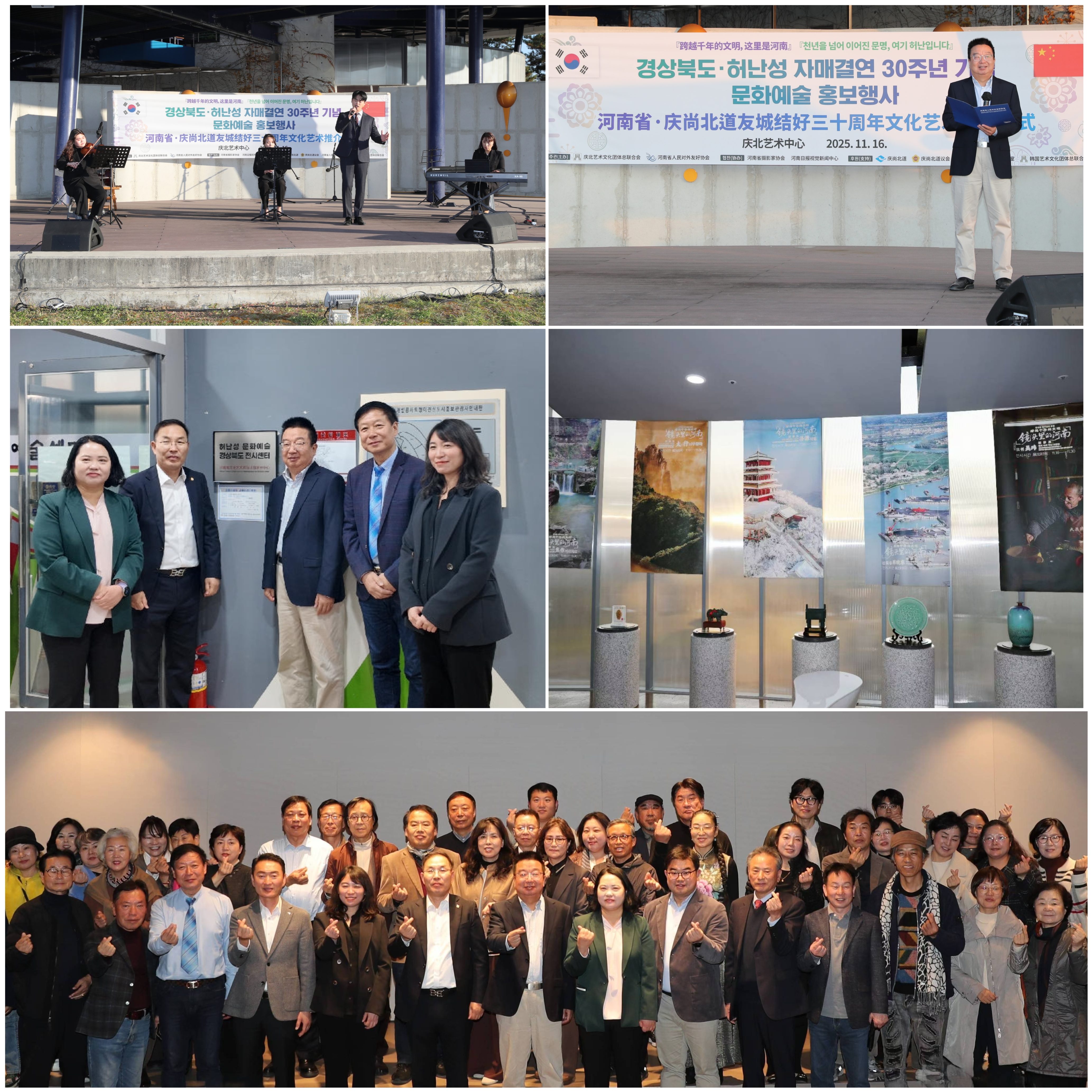 11月16日,由河南省人民对外友好协会与韩国庆尚北道联合主办的“跨越千年的文明,这里是河南”——河南省·庆尚北道友城结好三十周年系列文化交流活动在韩国庆尚北道安东市庆北艺术中心圆满落幕。河南省委外办二级巡视员艾帆、庆尚北道文化艺术课课长韩英熙、韩国艺总庆尚北道分会会长权吾洙出席活动并分别致辞,共同见证豫韩两地交流互鉴成果。