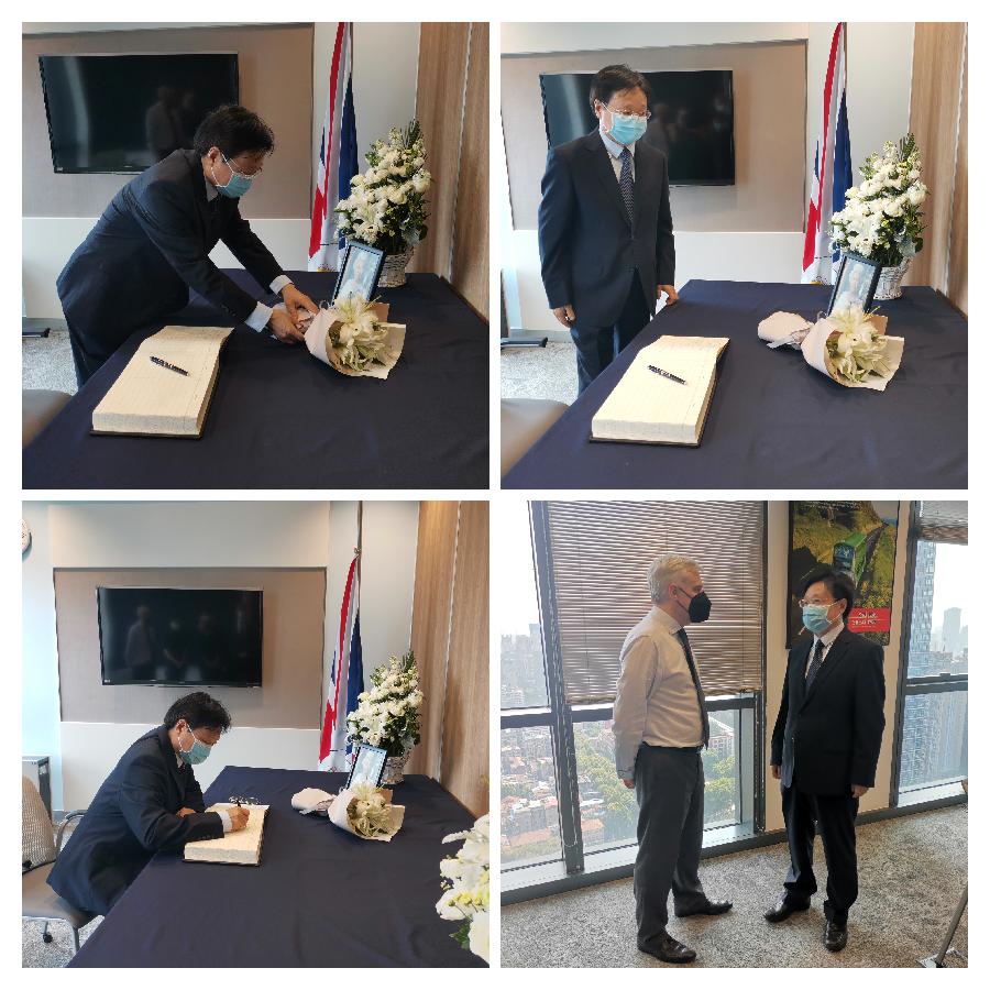 9月15日,受河南省委外办主任梁杰一委托,省委外办副主任、一级巡视员王自文前往英国驻武汉总领事馆吊唁英国女王伊丽莎白二世逝世。