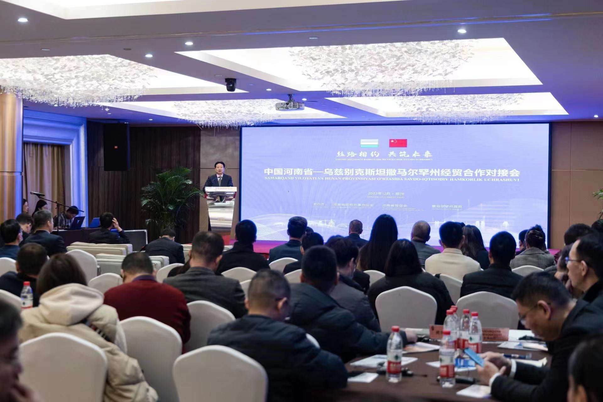 会见结束后,由省政府外办、省贸促会,撒马尔罕州政府共同主办的“丝路相约 共筑未来”中国河南省——乌兹别克斯坦撒马尔罕州经贸合作对接会在郑州举办,来自两省州多个地市的政府、商贸机构负责人和各行各业百余家企业、机构代表共150余人参会,共谋商机,共促合作。