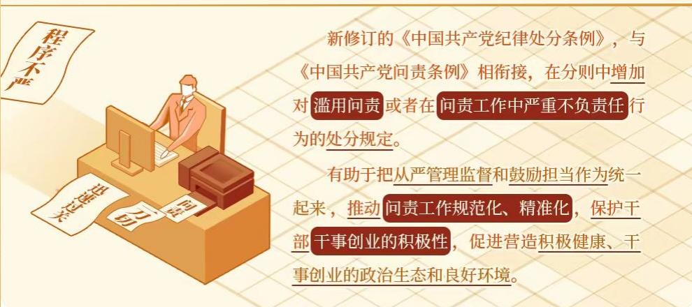新修订的《中国共产党纪律处分条例》,与问责条例相衔接,在分则中增加对滥用问责或者在问责工作中严重不负责任行为的处分规定,有助于把从严管理监督和鼓励担当作为统一起来,推动问责工作规范化、精准化,保护干部干事创业的积极性,促进营造积极健康、干事创业的政治生态和良好环境。